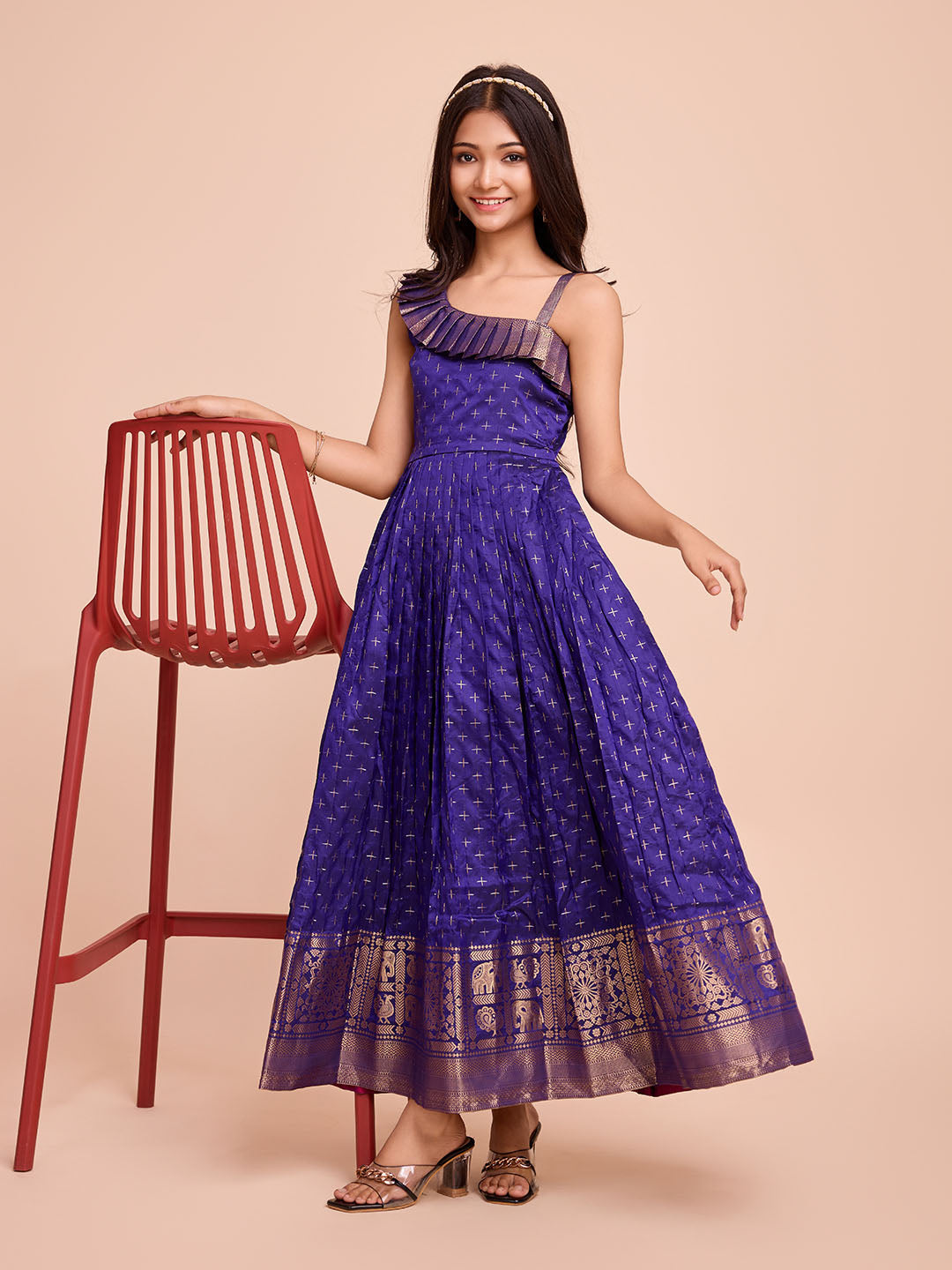 The saree showcases an elegant woven pattern with graceful pleating design, giving it a festive and sophisticated look. Designed with a full inner lining for added comfort and ease of wear, this outfit ensures your child feels comfortable throughout any celebration.