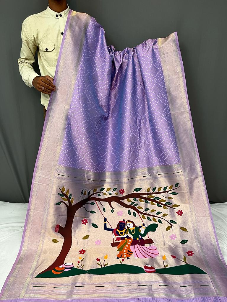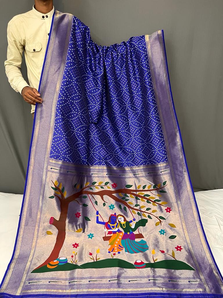 Crafted in pure heavy silk fabric, this saree features an exquisite bandhani concept weaving across the body, creating a rich and graceful texture. The highlight is its stunning Paithani pallu, beautifully detailed to enhance its luxurious appeal.