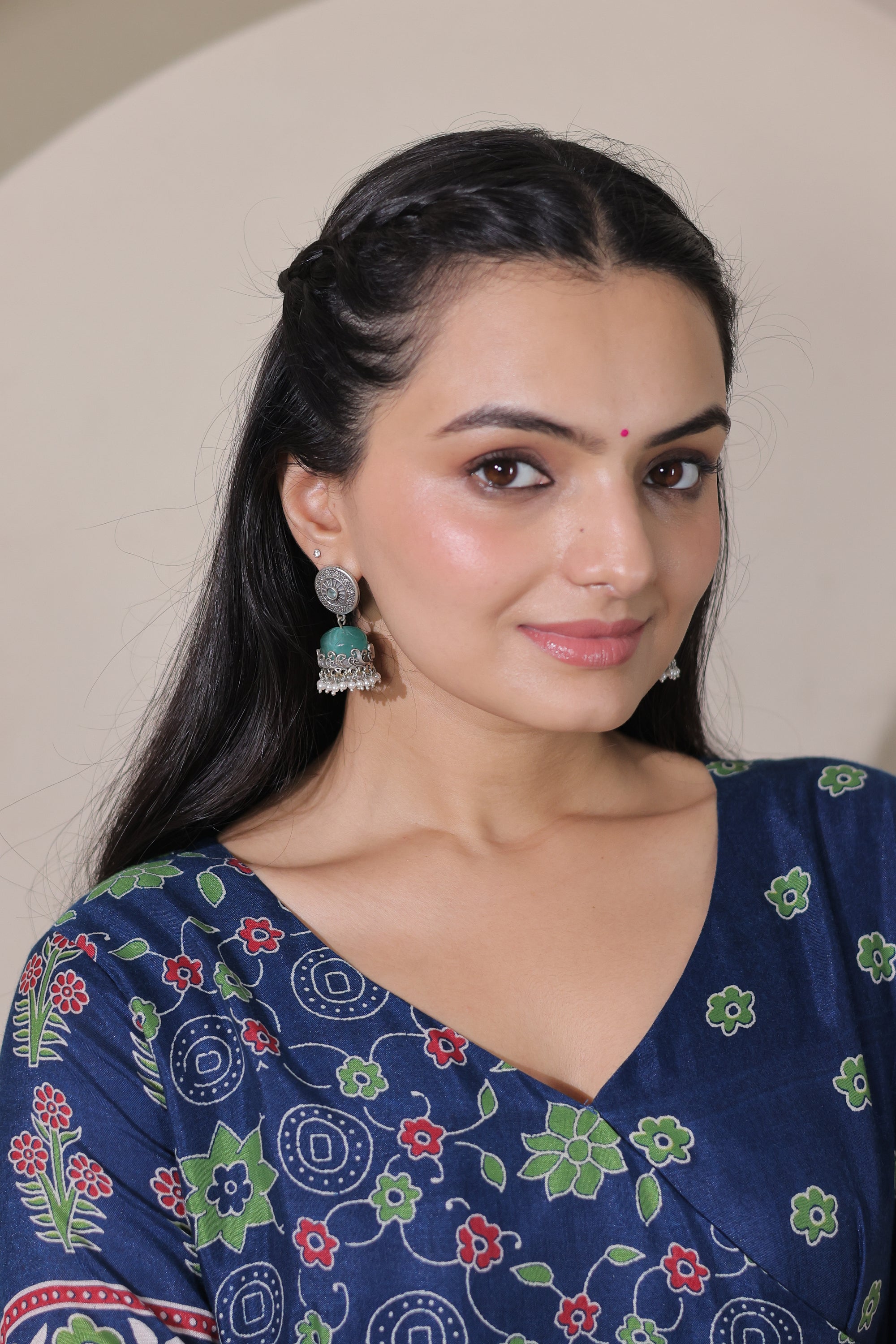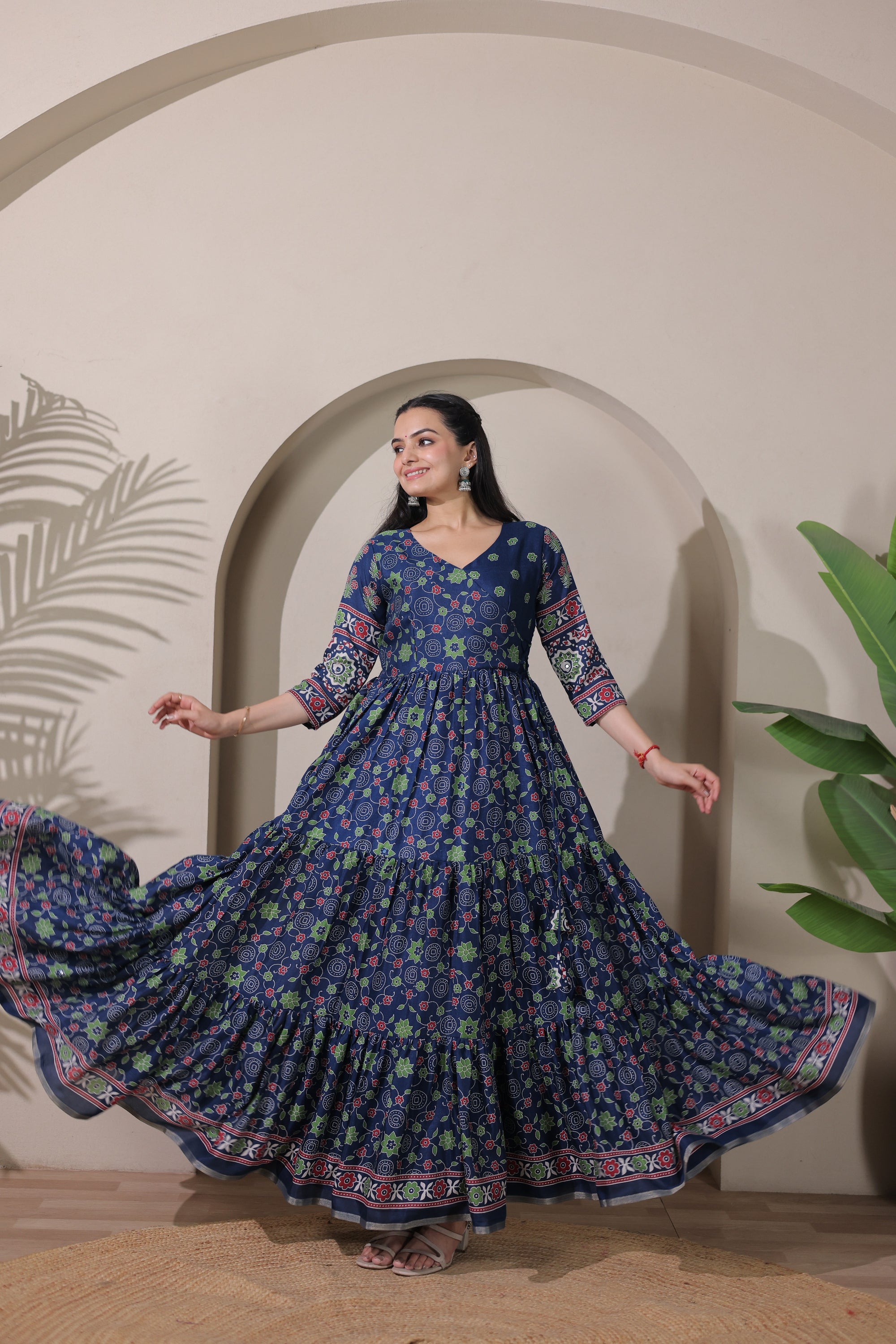A beautifully crafted tiered Angarakha gown featuring a graceful flare and delicate embroidery highlights. This elegant piece flows effortlessly, making it perfect for any special occasion. Experience a stunning blend of tradition and modern charm that will make you stand out.
