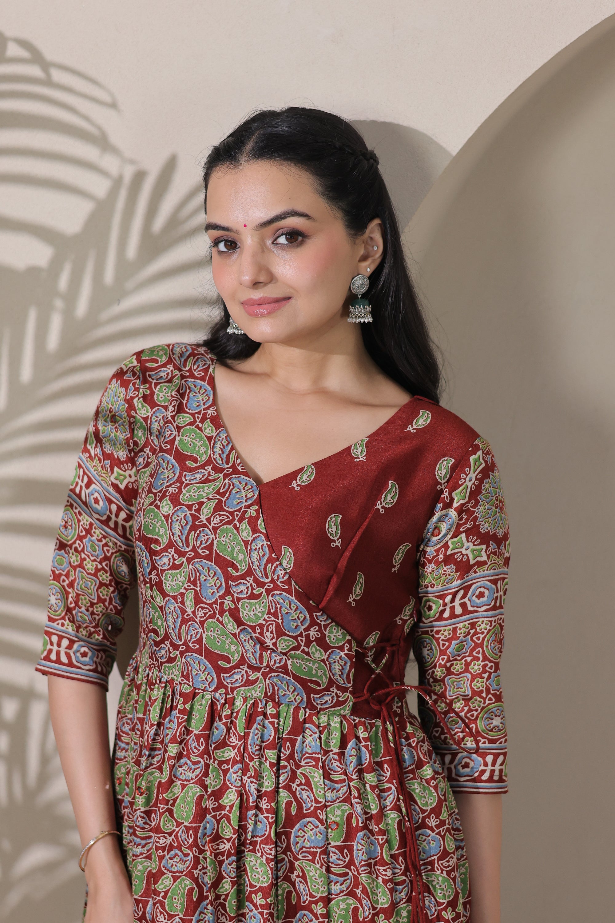 This tiered Angarakha gown combines traditional silhouettes with contemporary elegance, featuring intricate embroidery details that add a touch of sophistication to the flowing design.
