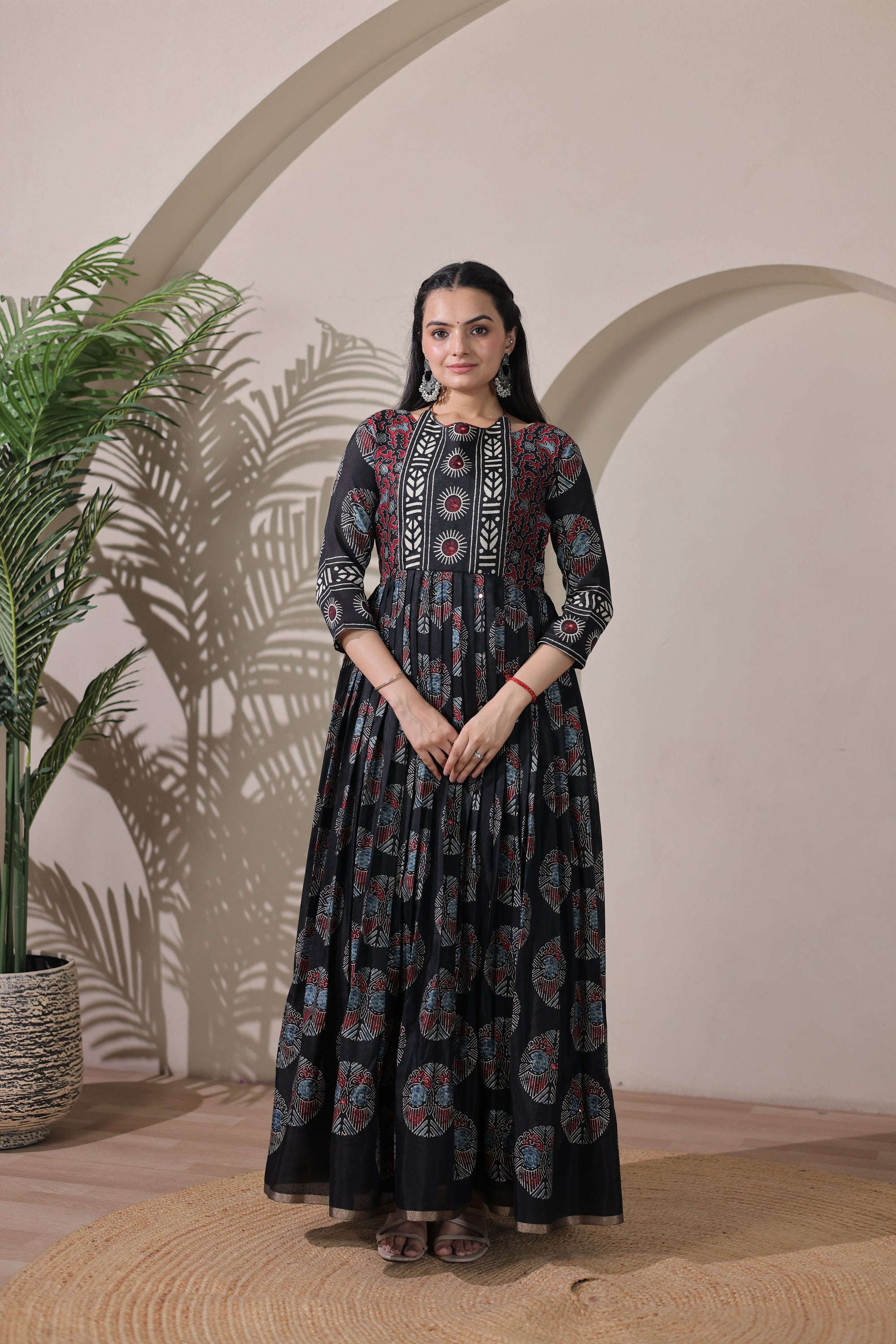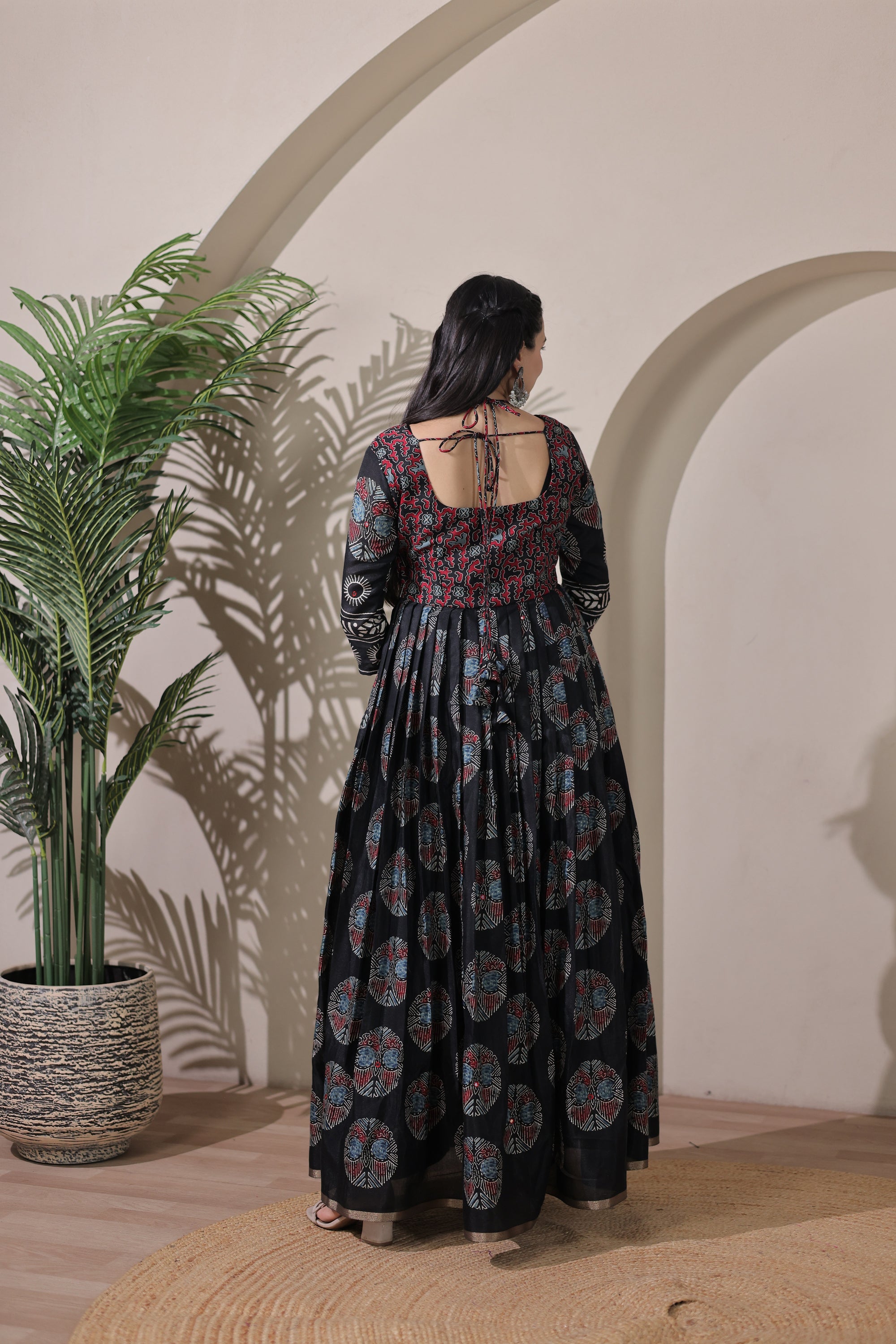 A beautifully flared gown designed for effortless elegance, featuring a graceful neck tie-up that adds a refined touch. Enhanced with a stunning print pattern for a timeless look that transitions seamlessly from day to evening.