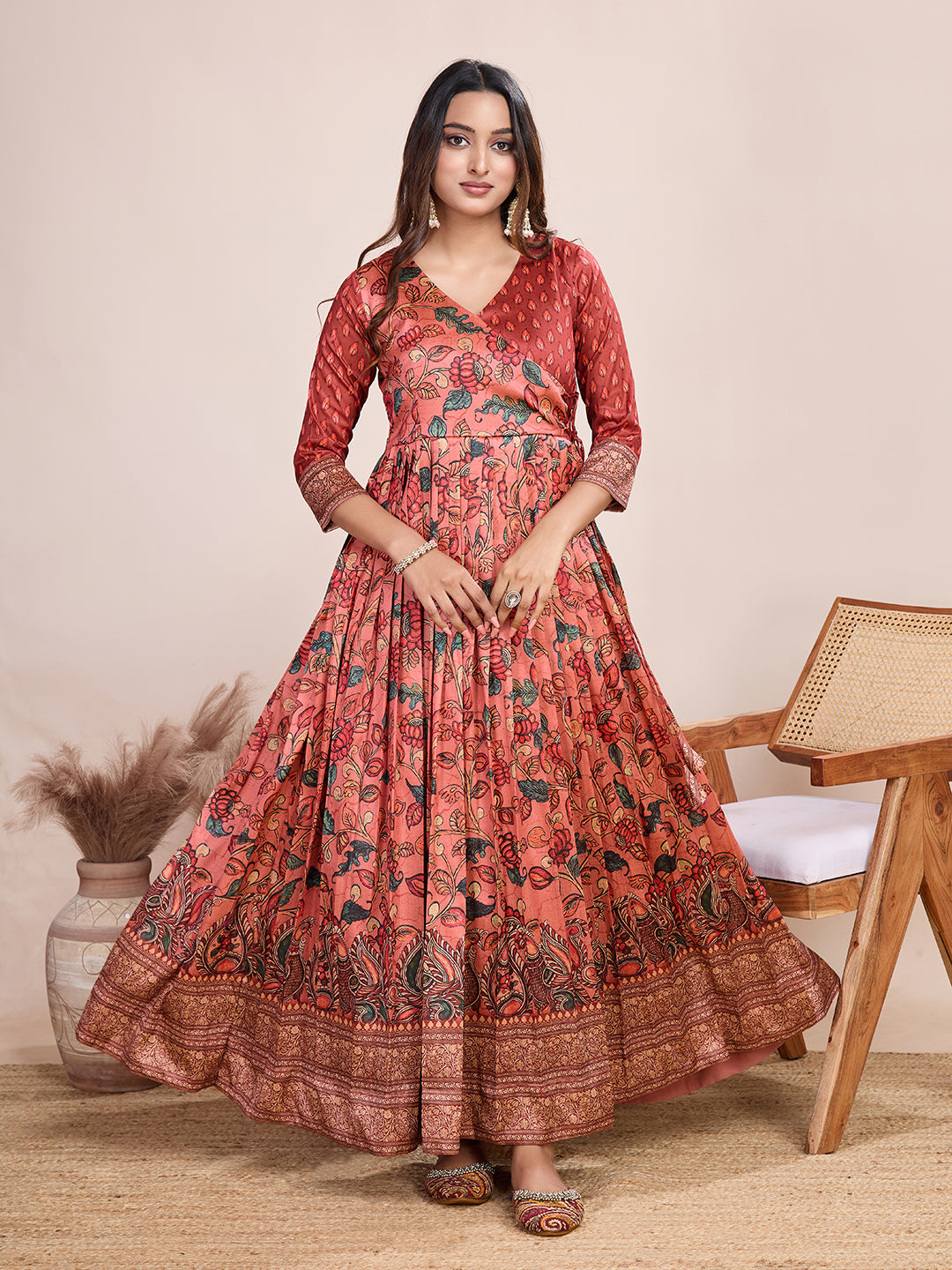 Elegant Coral Floral Anarkali Gown - Silk Blend