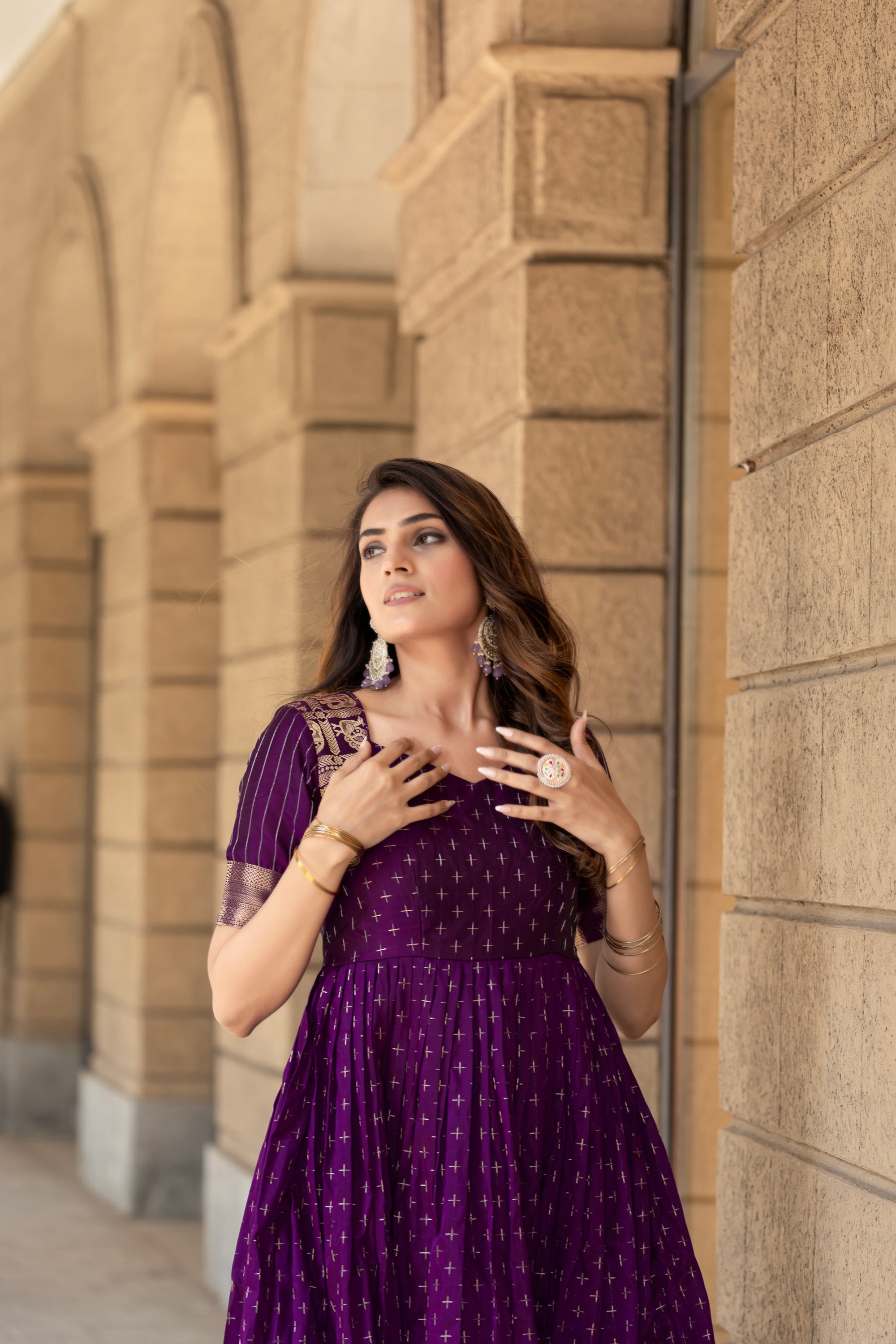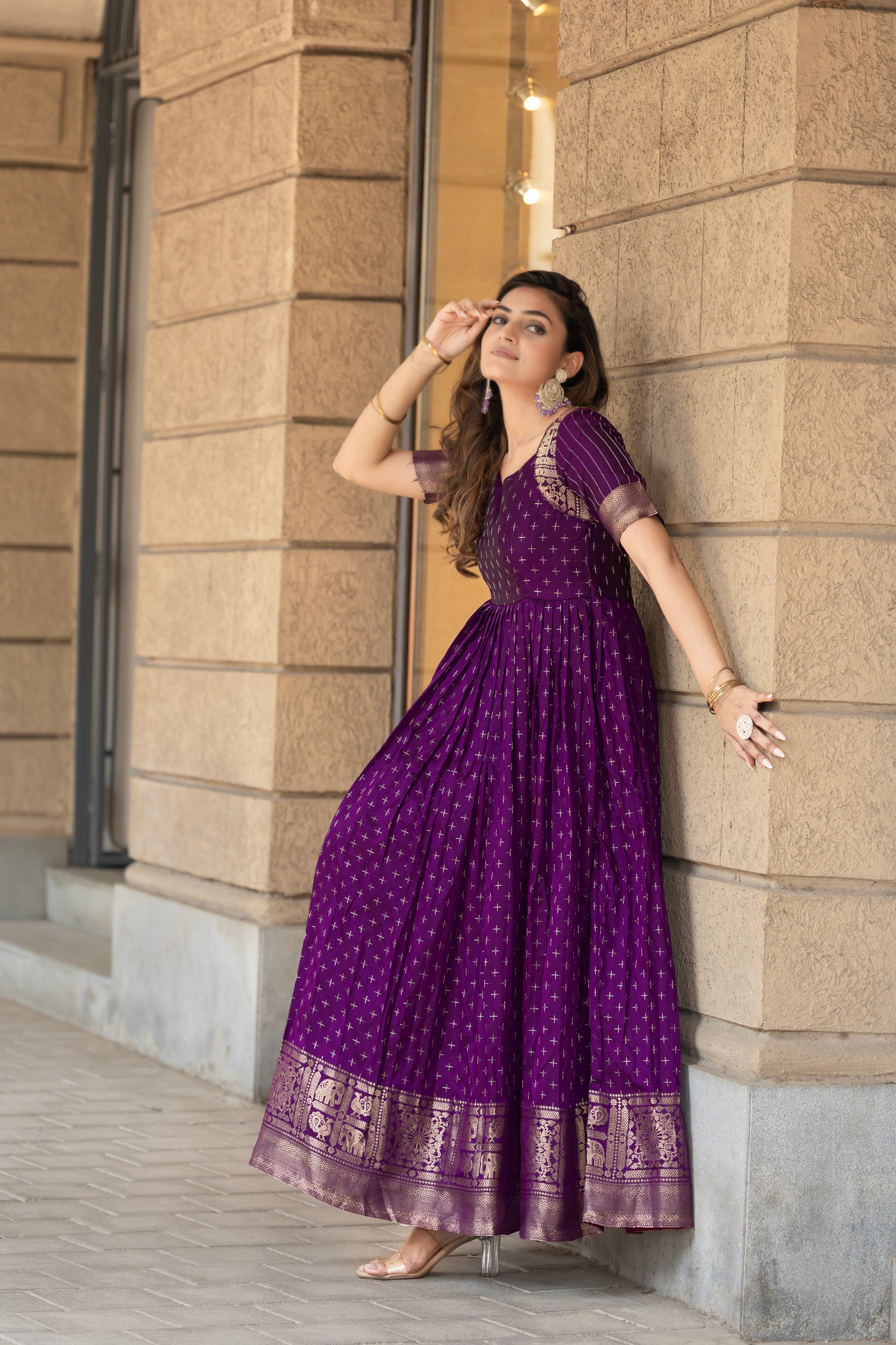 Elegant flared gown with intricate zari weave, figure-detailed border, sweetheart neckline, and short sleeves crafted in a graceful, timeless pattern. This exquisite piece showcases masterful weaving techniques with luxurious zari work that adds shimmer and sophistication to your look.