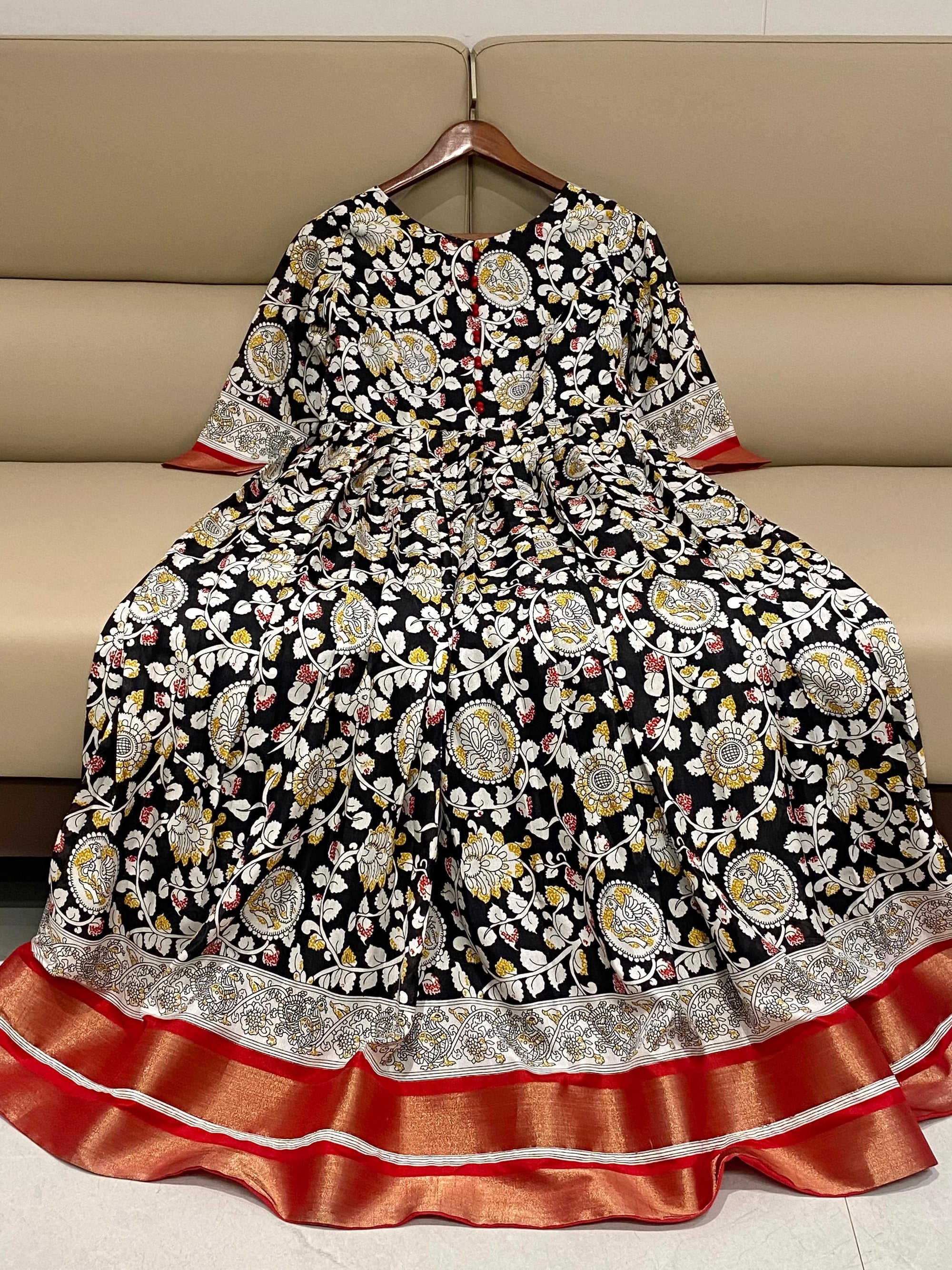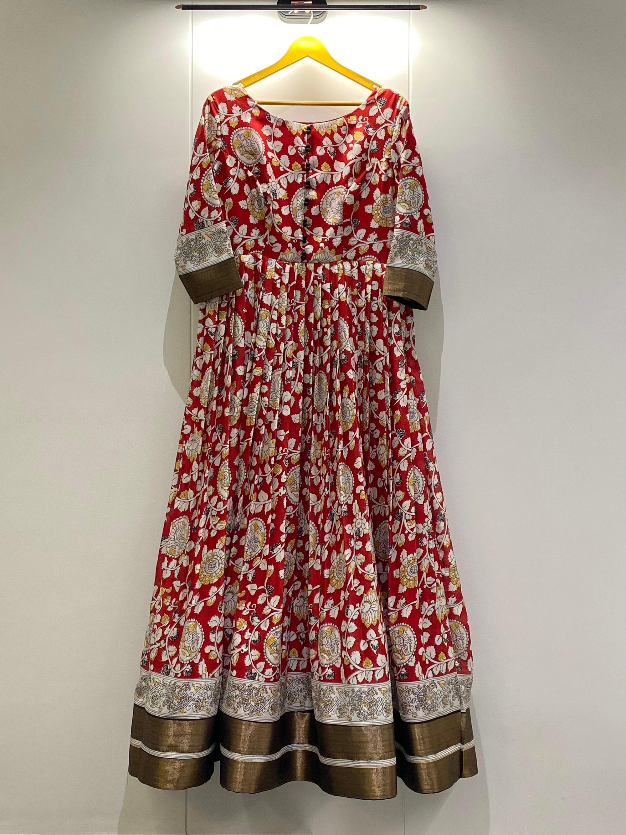 Graceful red Kalamkari gown featuring 3/4th sleeves and a beautifully woven contrast border, blending tradition with elegance. This stunning piece showcases the timeless art of Kalamkari printing, where intricate patterns and rich colors come together to create a captivating look.