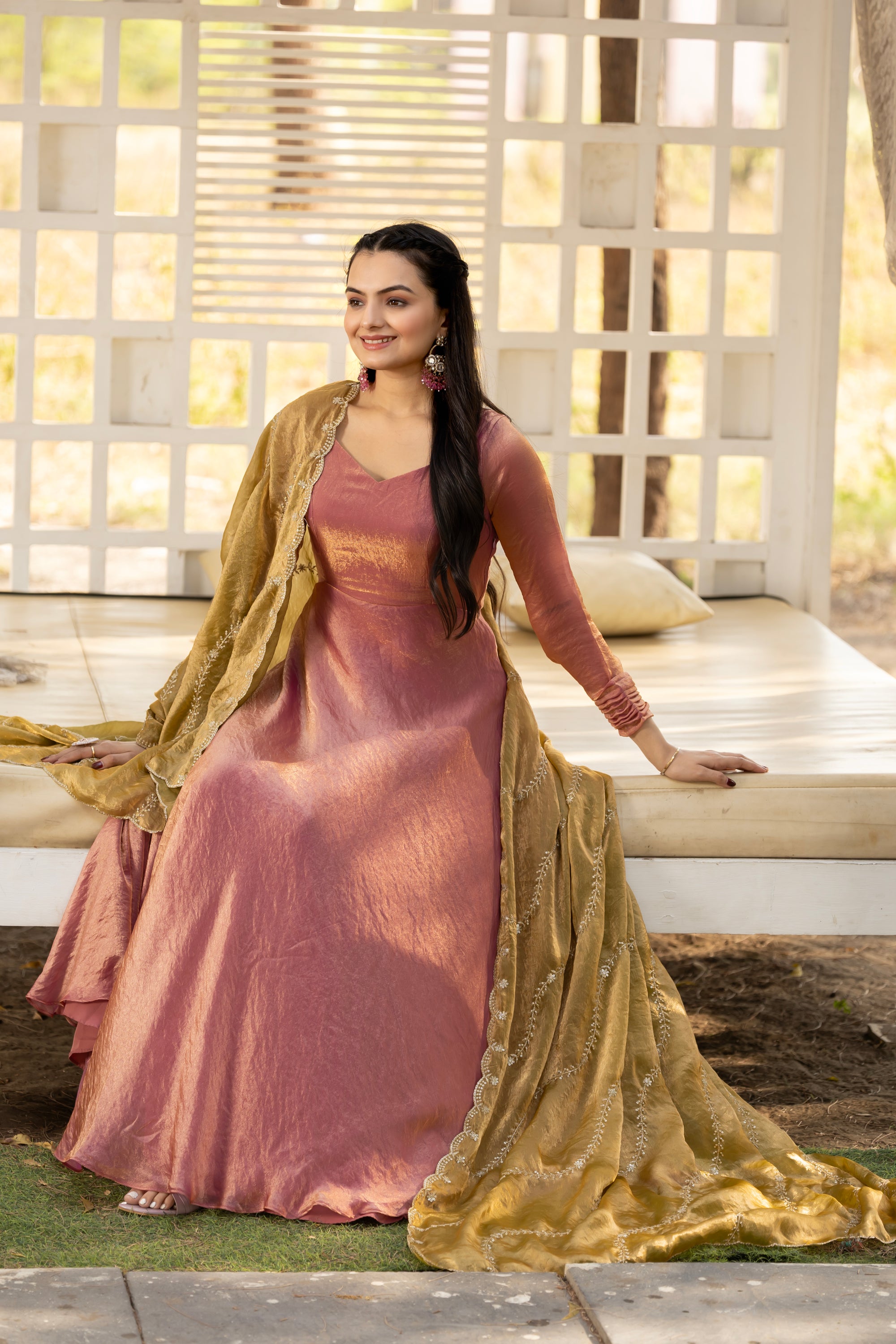 This elegant space silk gown features a flared silhouette with exquisite details on the sleeves, adding texture and sophistication to the overall design. Paired with a contrast-colored zari embroidered and scalloped border dupatta, it enhances the look with intricate, shimmering designs, making it a perfect choice for special occasions.