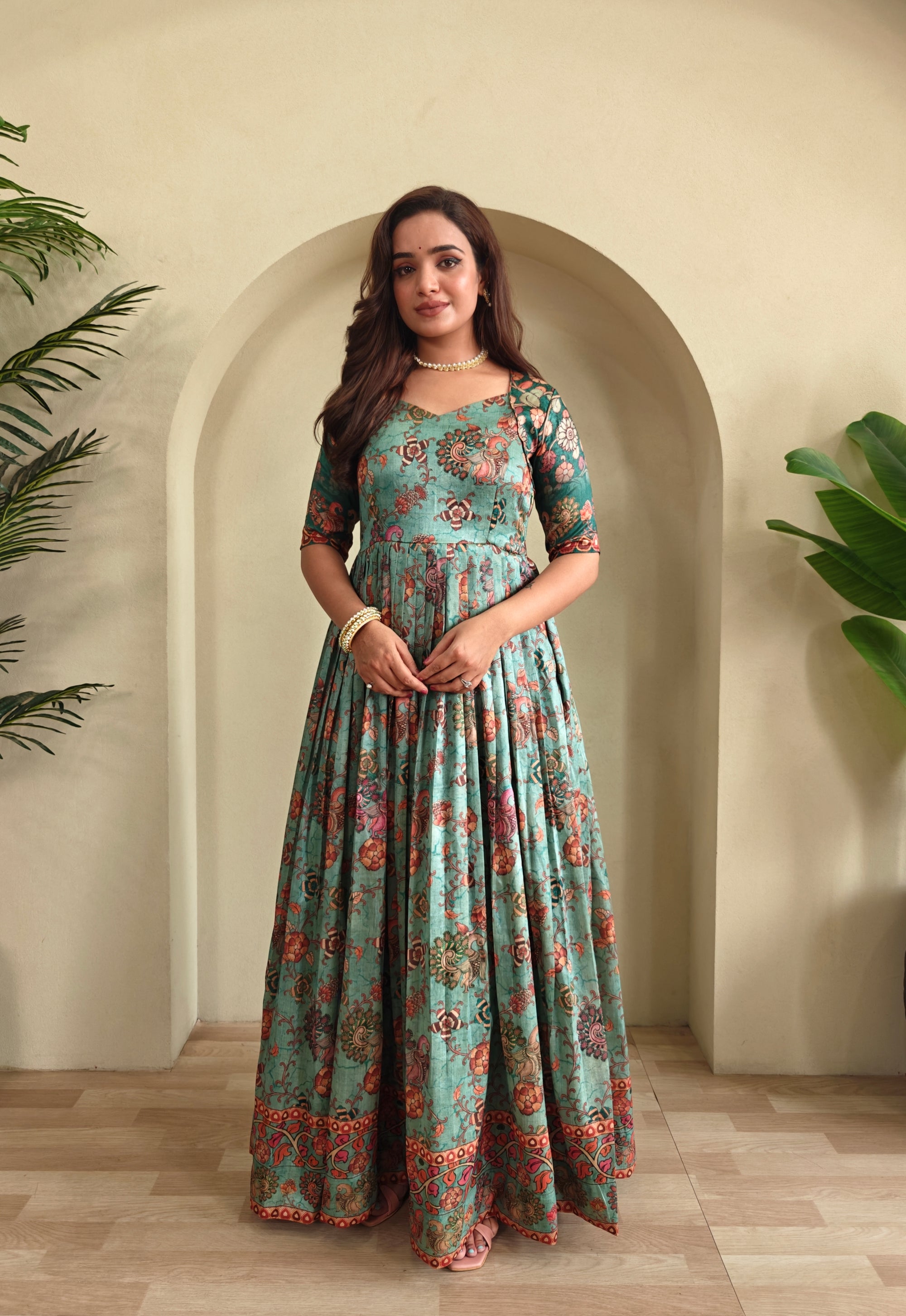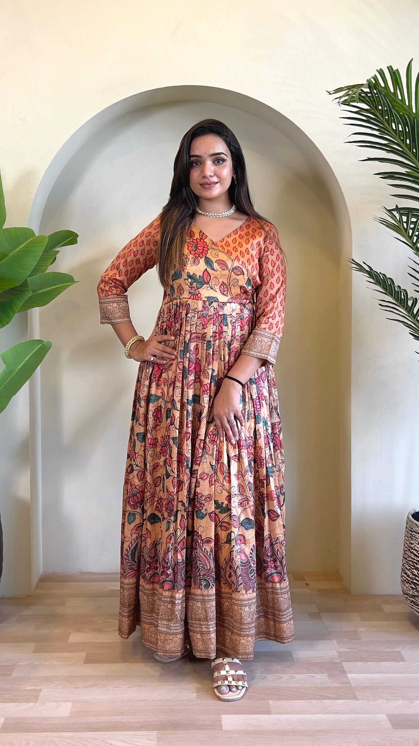 This silk blend Anarkali gown features beautiful Kalamkari prints with a delicate border and a flattering tie-up design. The flowing silhouette exudes elegance, making it perfect for festive and formal occasions.