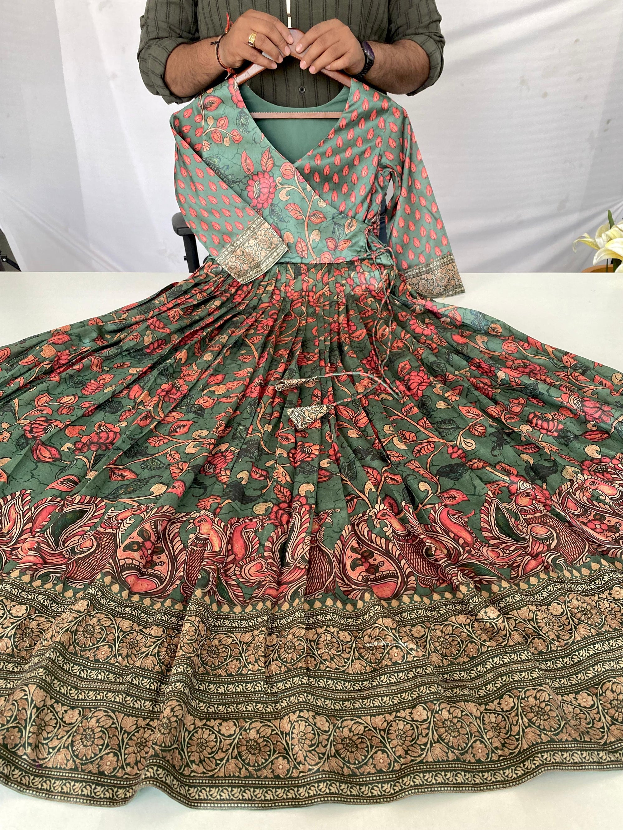 This elegant Anarkali gown showcases traditional Kalamkari artistry with its intricate prints and delicate border detailing. The tie-up design adds a contemporary touch while the flowing silhouette ensures graceful movement and comfort throughout your special occasion.