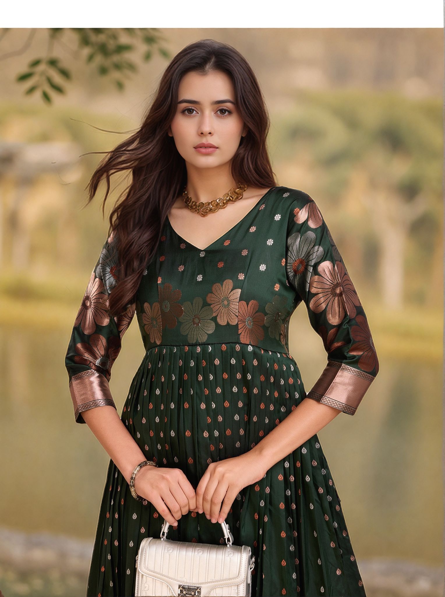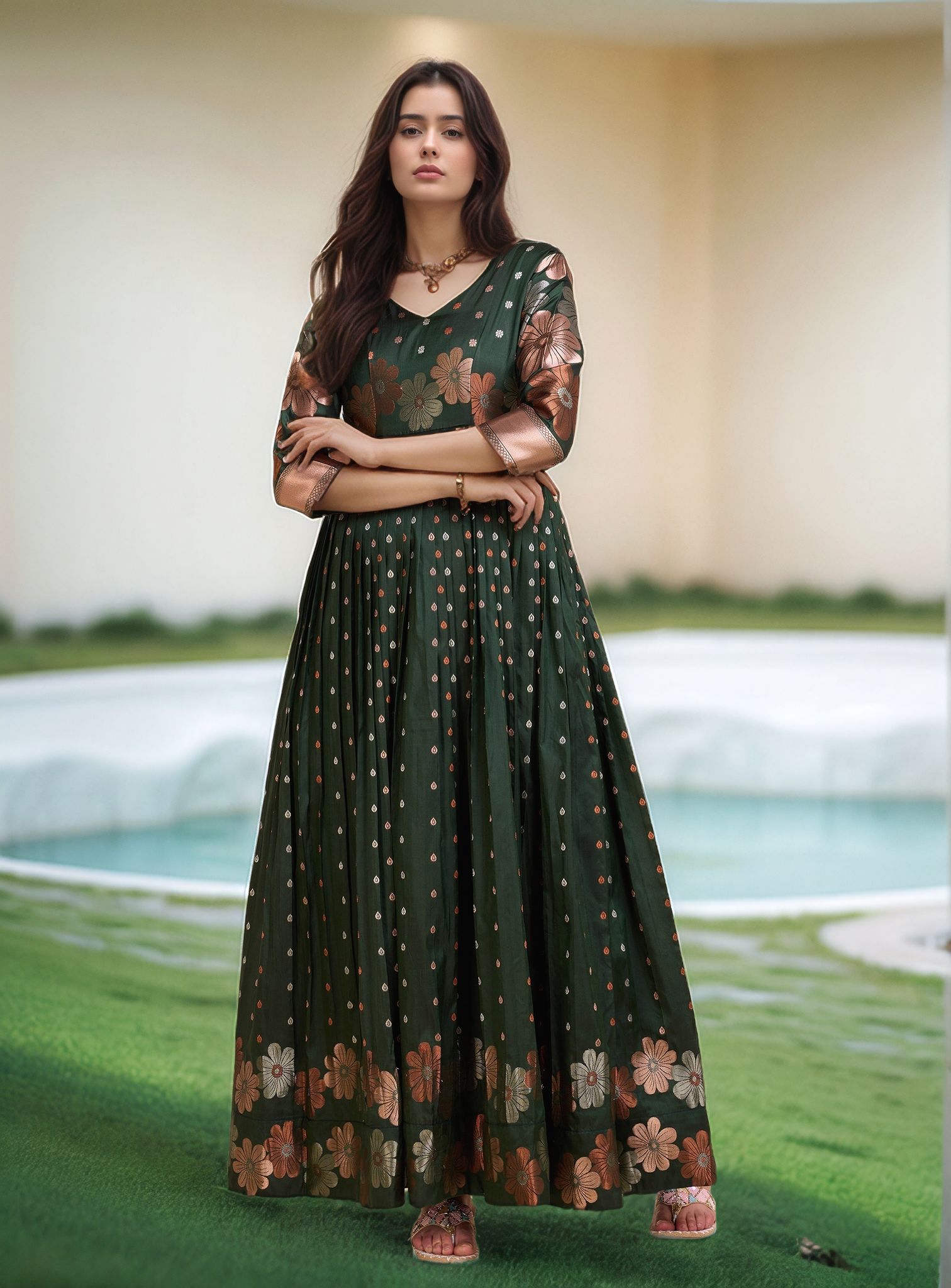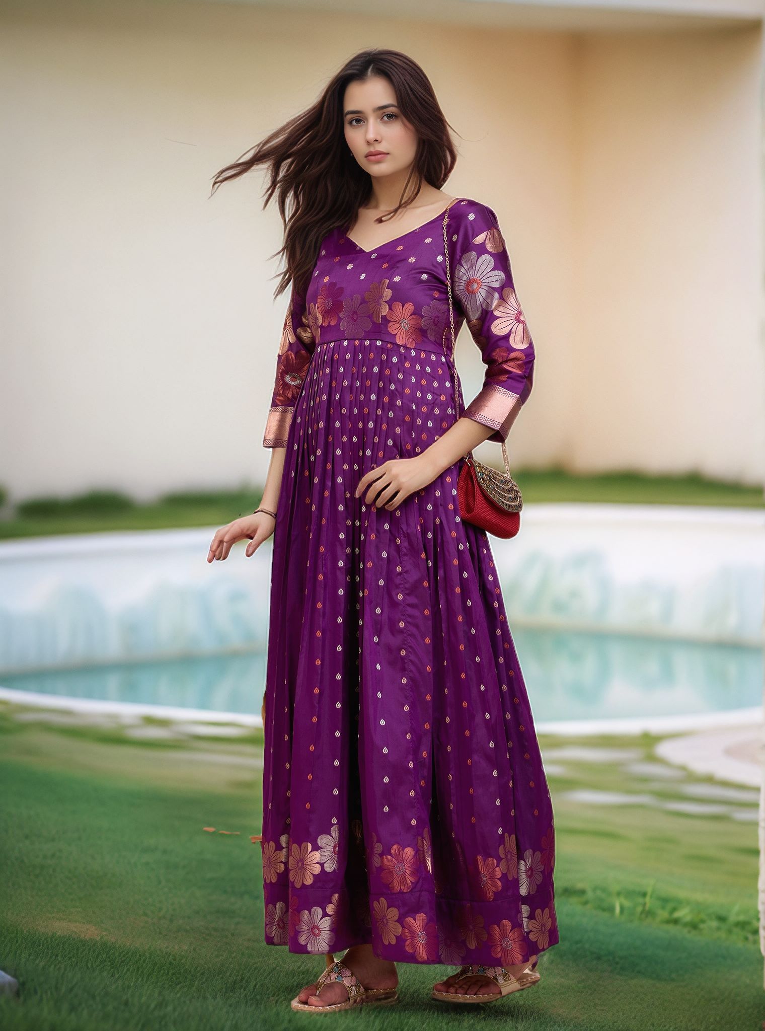 This stunning maxi dress combines the richness of Banarasi weaving with contemporary design elements. The luxurious soft silk fabric features intricate copper and gold zari work on the sleeves, creating a regal appearance. The boat neckline offers a sophisticated look, while the keyhole back detail adds a modern edge. The classic knife pleats in the flare ensure elegant draping and movement, making this piece perfect for weddings, festive celebrations, and special occasions.