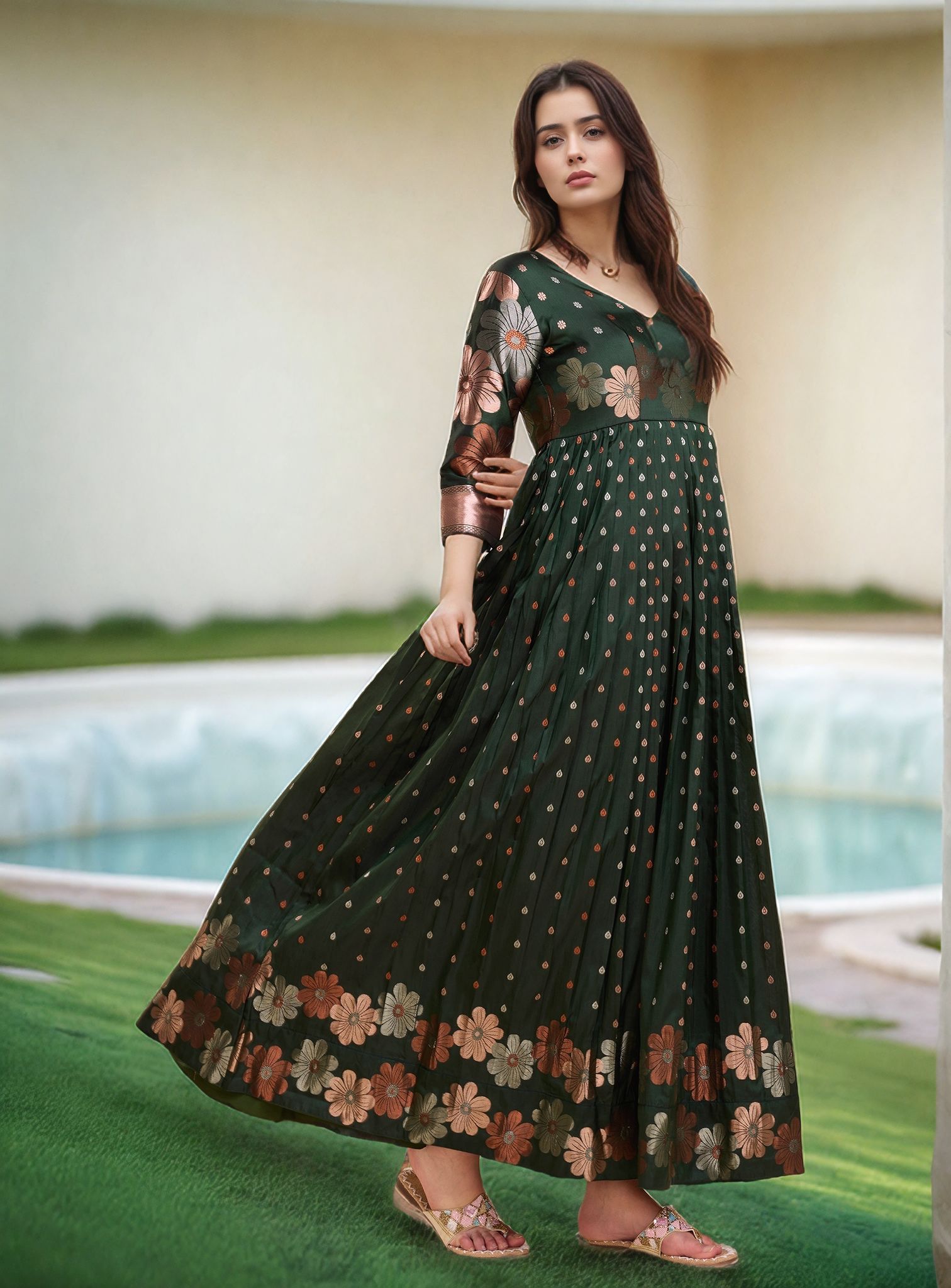 Bring out a glorious traditional gown with a modern silhouette featuring an elegant boat neck and exquisite Banarasi zari weaving sleeves. The back comes with a decent keyhole shape adding a contemporary touch, while the flare showcases classic knife pleats for graceful movement and timeless elegance.