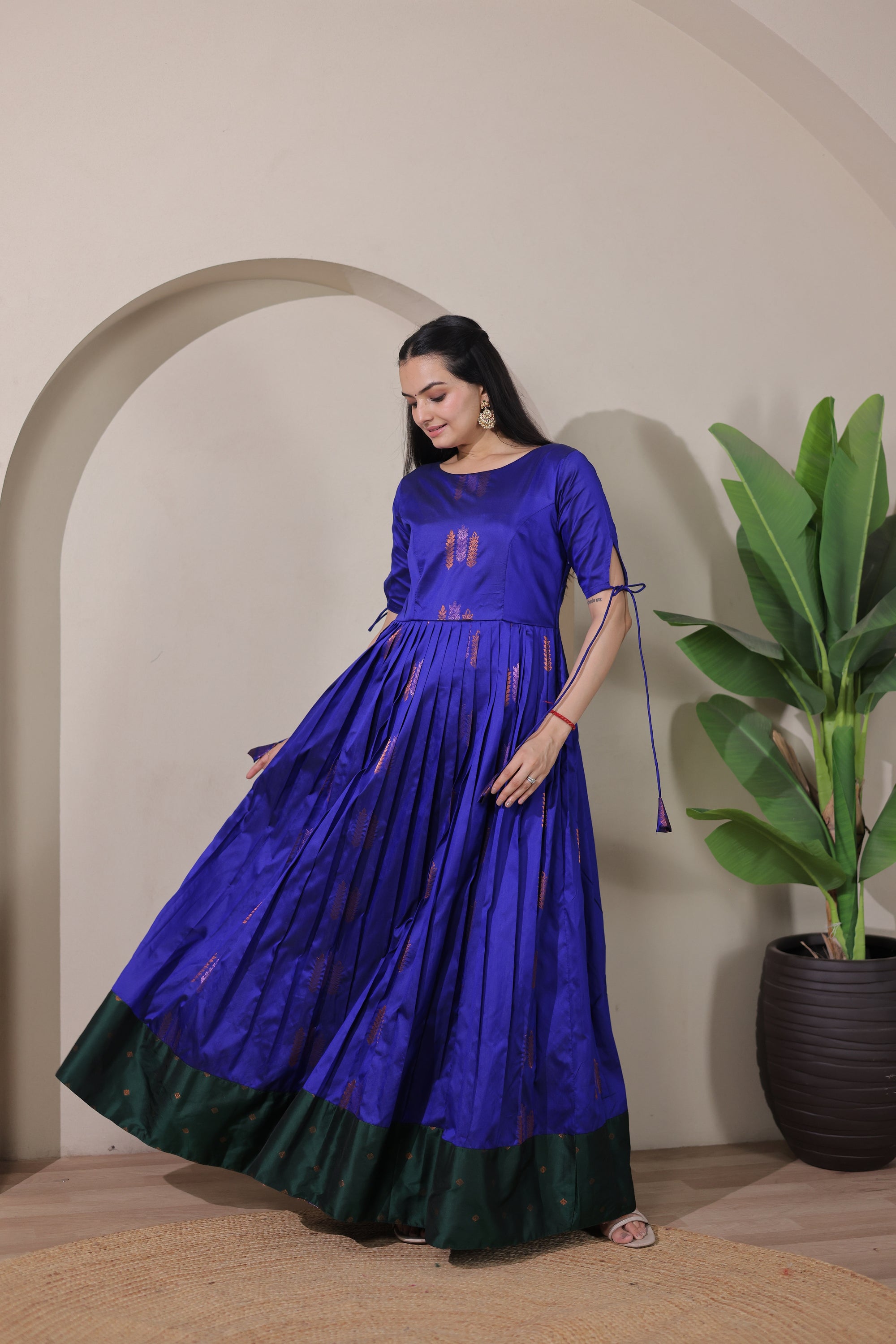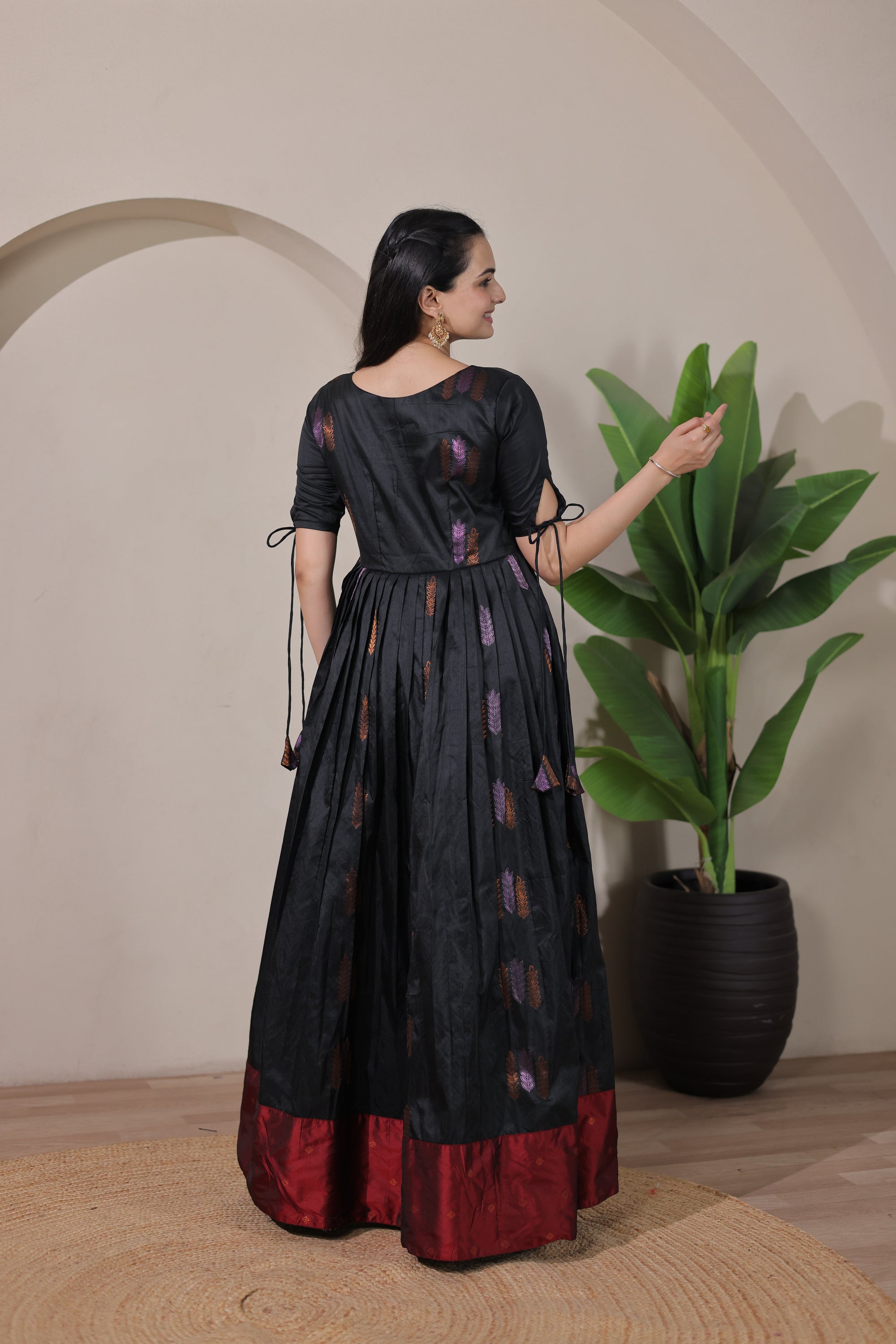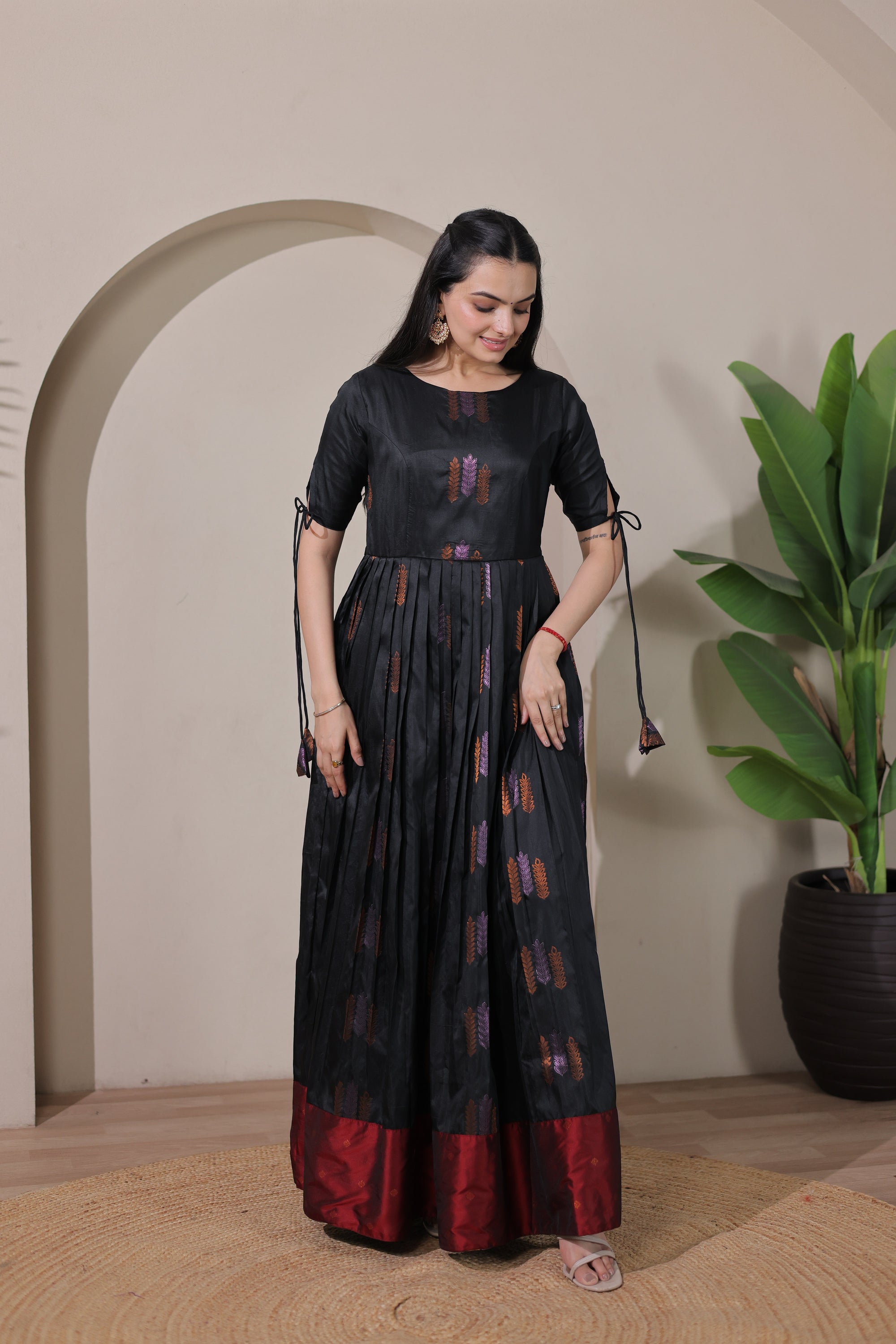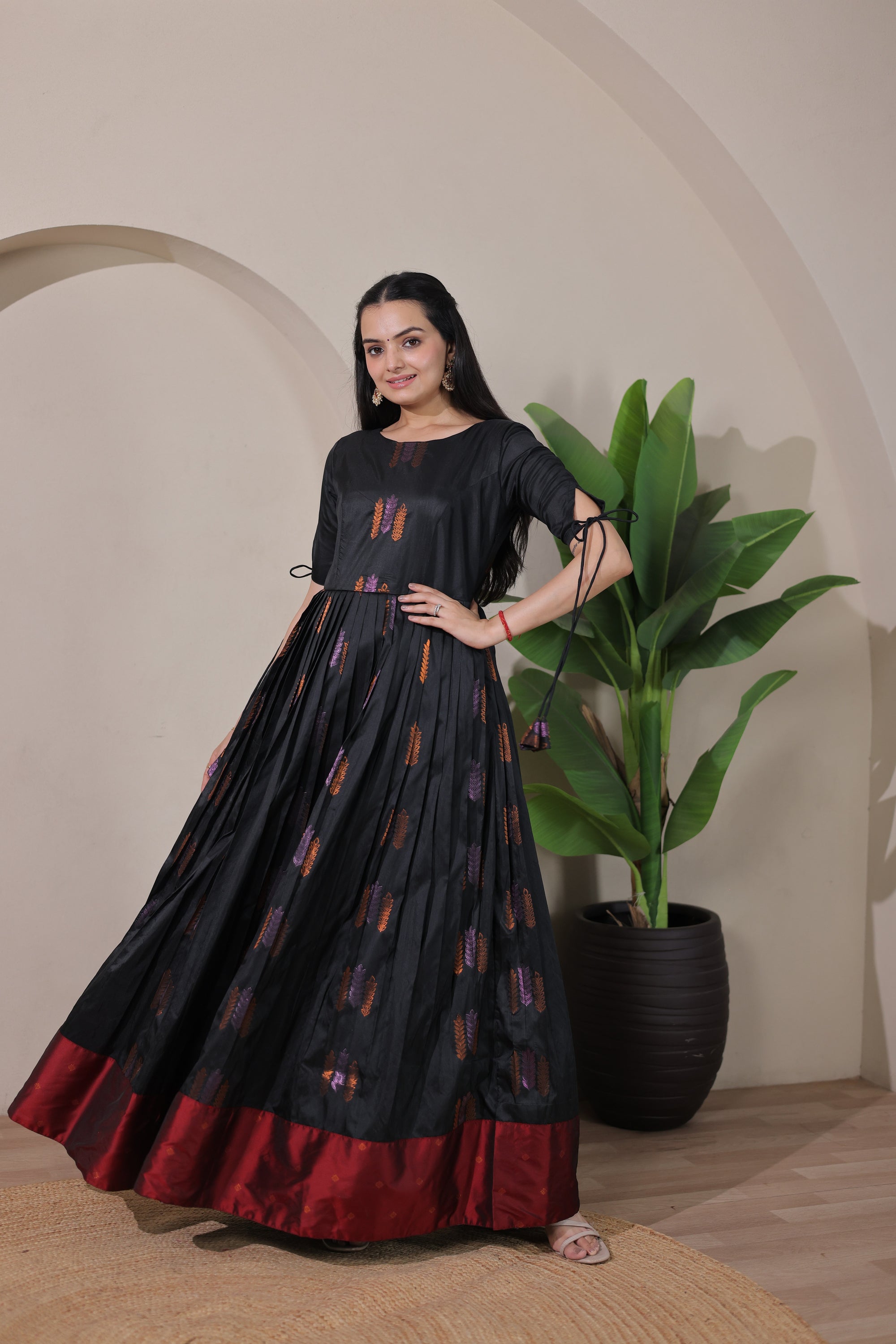 This beautifully crafted gown features luxurious soft silk fabric with an eye-catching broad contrast border that adds a striking visual element. The elegant tie-up sleeves provide a contemporary touch while maintaining traditional charm, making it ideal for festive celebrations and special events.