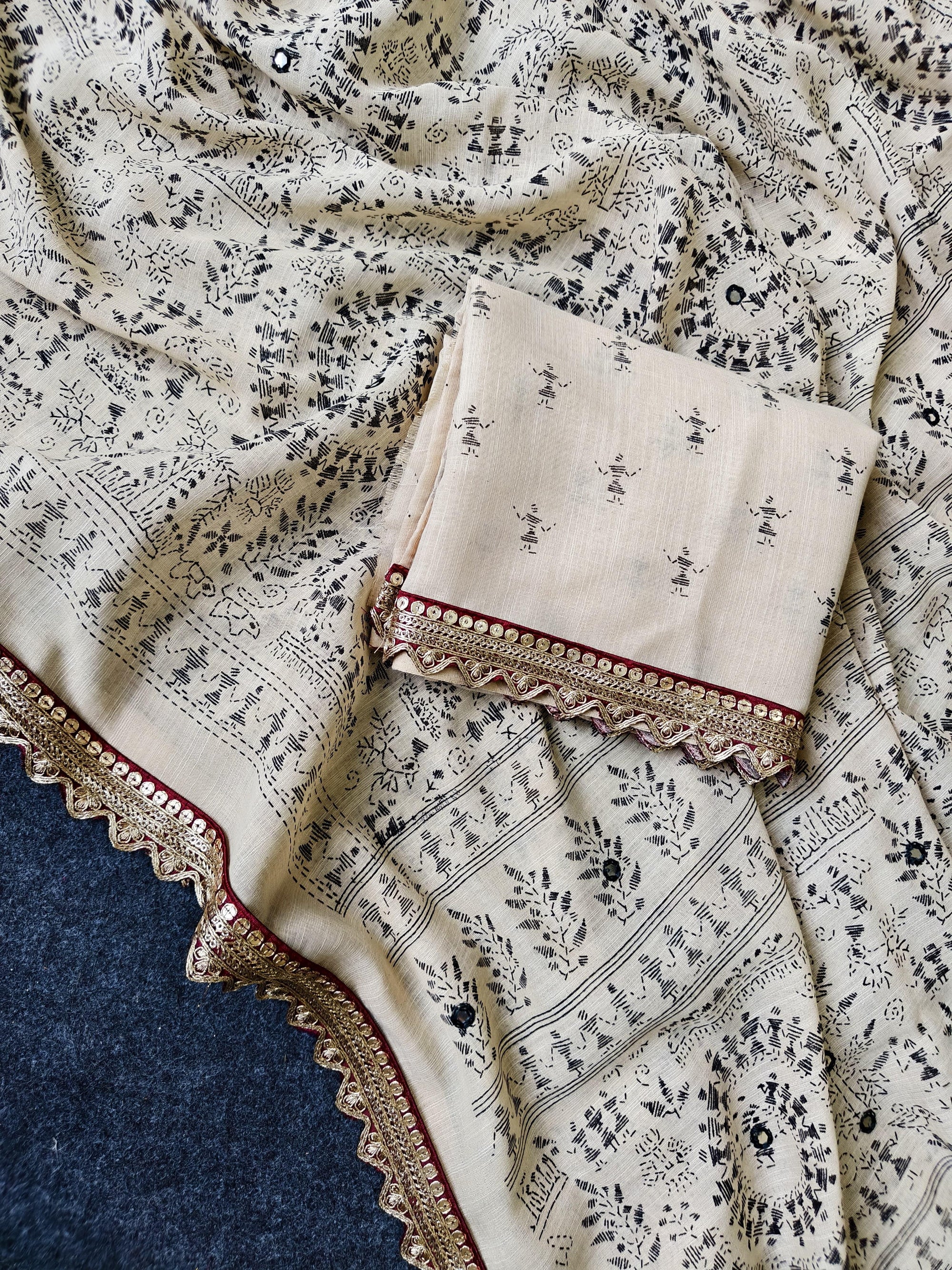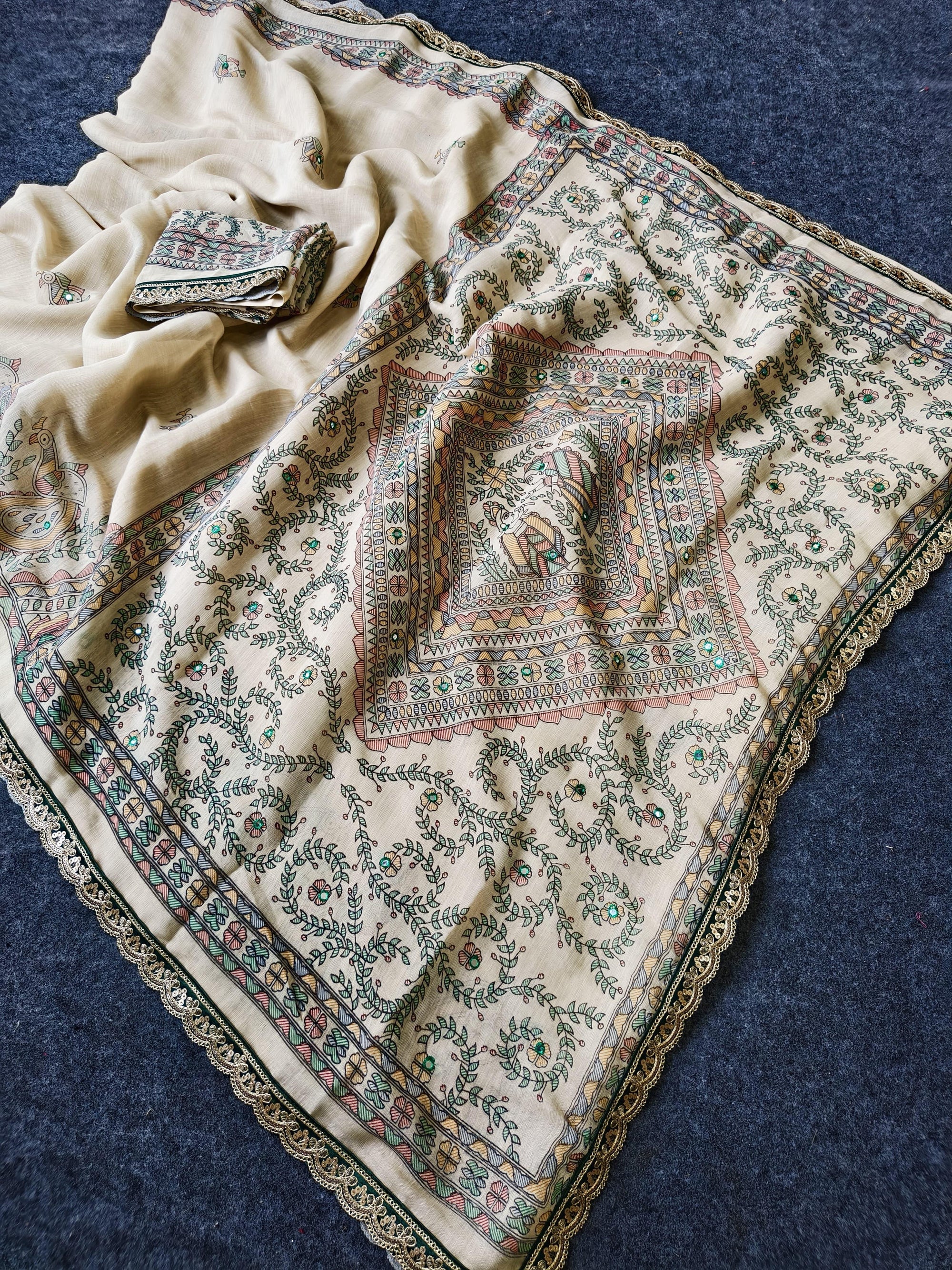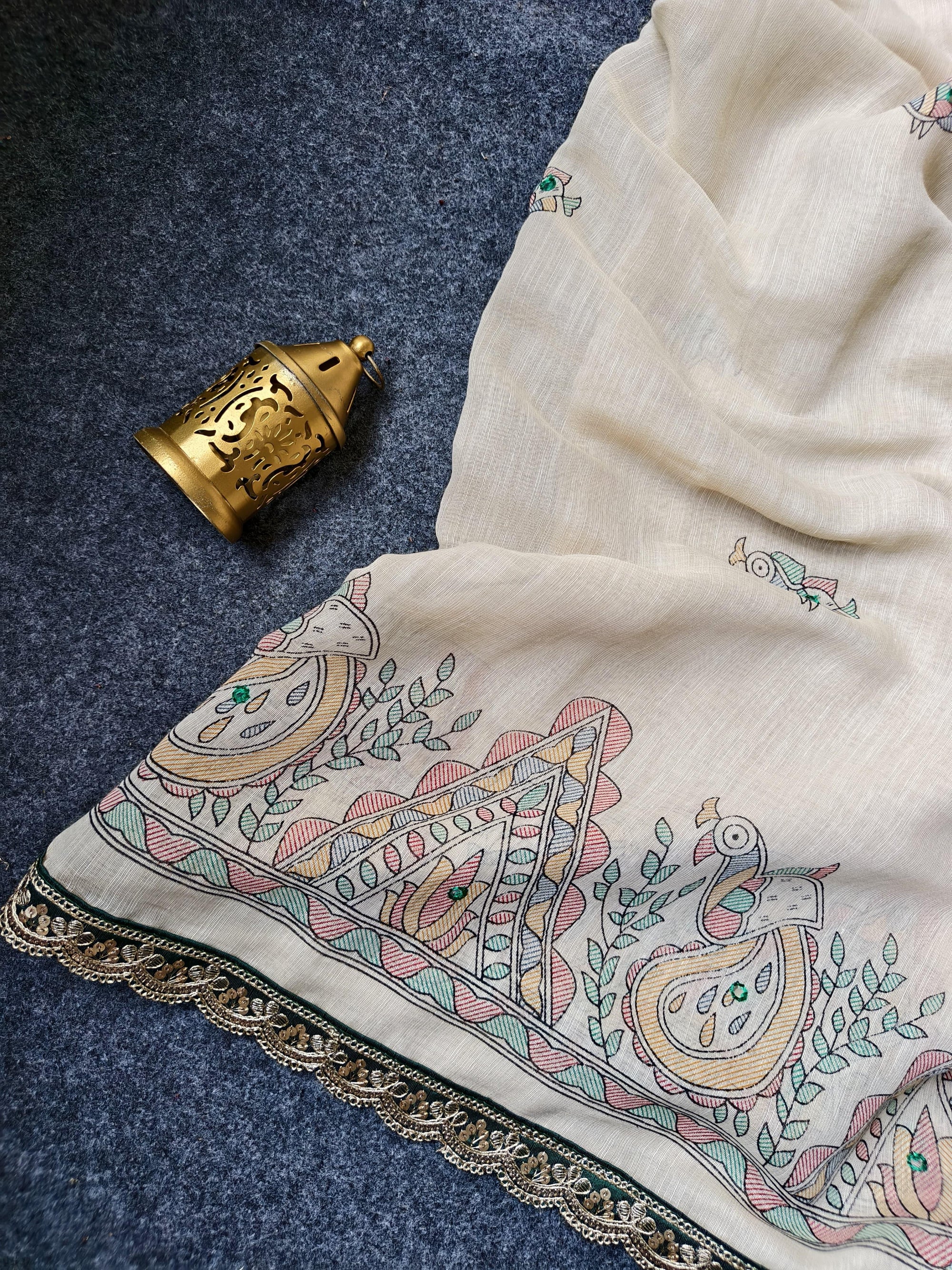 Fresh Arrival ❤️ Pure Madhubani Linen Saree with Aari Mirror Work & Scalloped Border