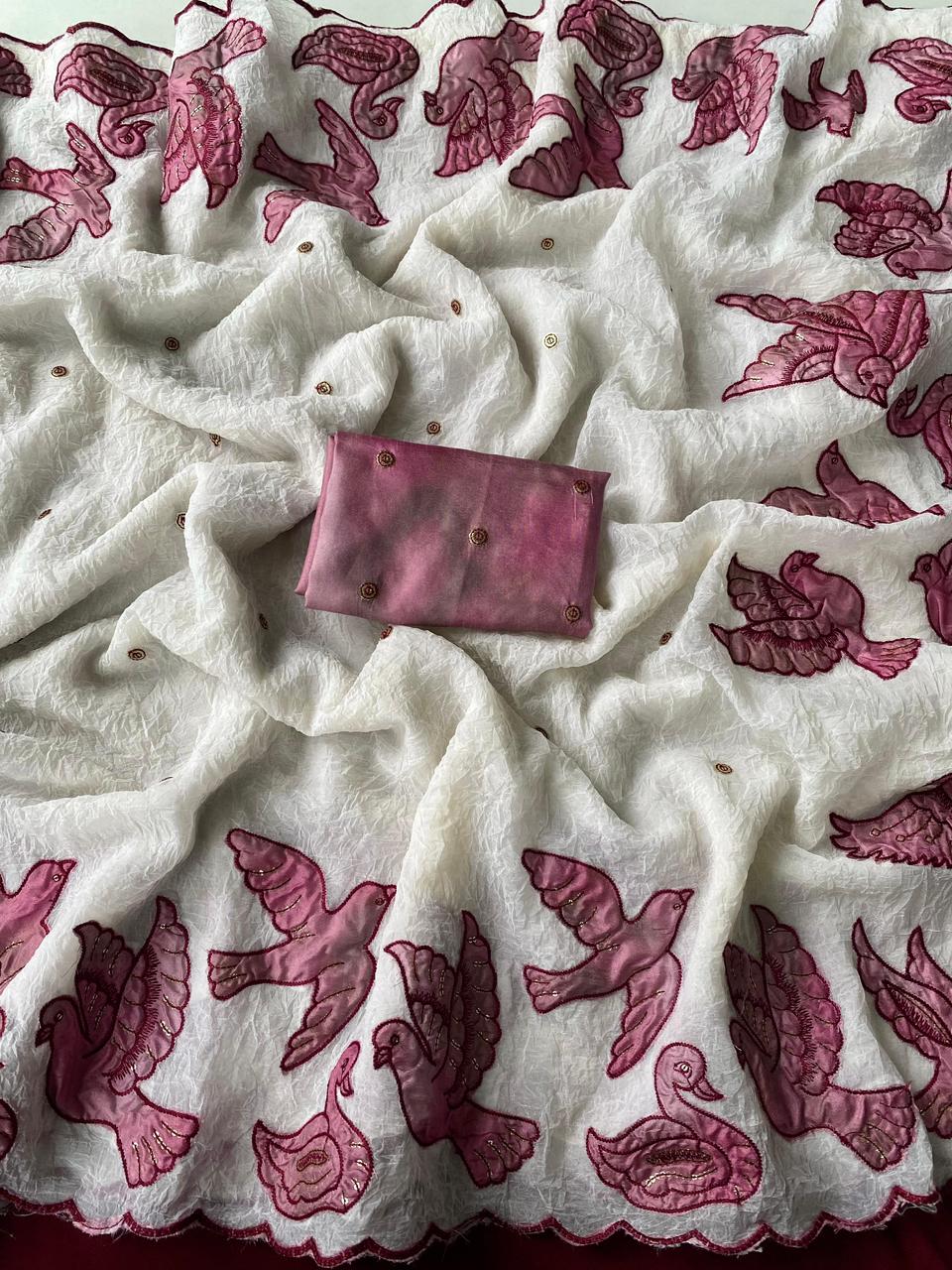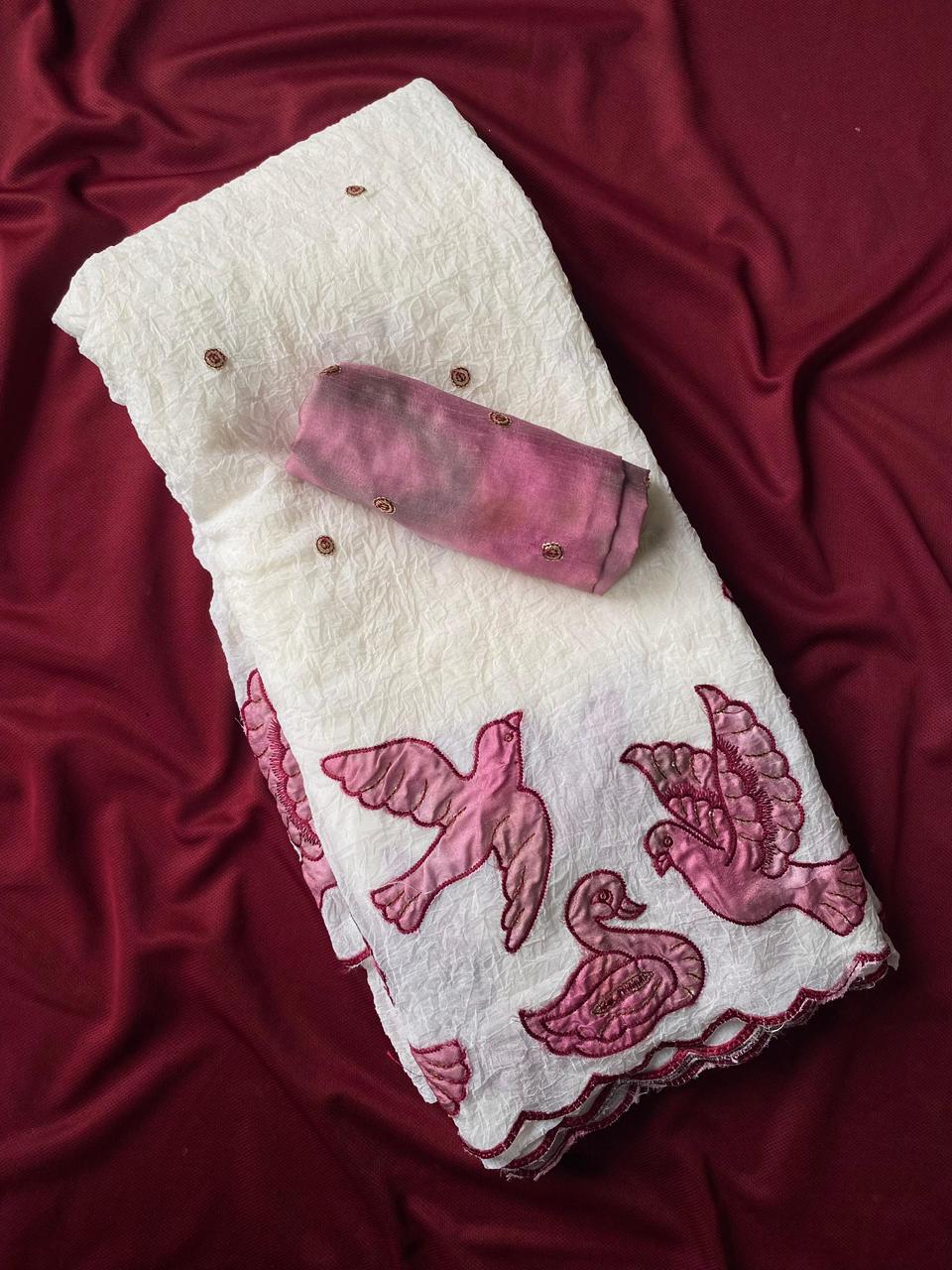 The saree is further highlighted with delicate foil mirror work that adds a subtle shimmer, making it perfect for festive gatherings, celebrations, and special occasions. A rich zari woven border completes the look, giving the saree a graceful and refined finish.
