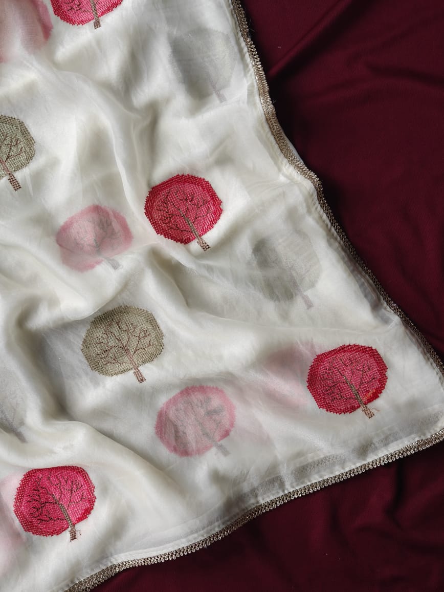 Pure Soft Satin Georgette Saree with Diamond Detailing & Cutwork Embroidered Border | Red Brocade Blouse